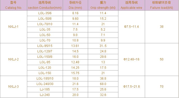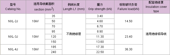 NXL 系列楔型耐張線夾適用于10KV及以下配電線路中,將架空絕緣鋁導或裸鋁導線固定在轉(zhuǎn)角或終端耐張桿的絕緣子上,從而將架空導線固定或拉緊,絕緣罩與耐張線夾本套使用,起絕緣防護作用。