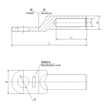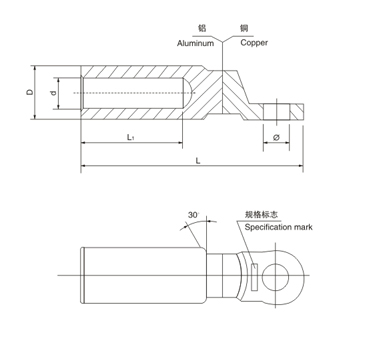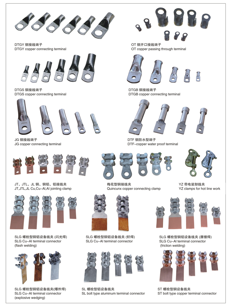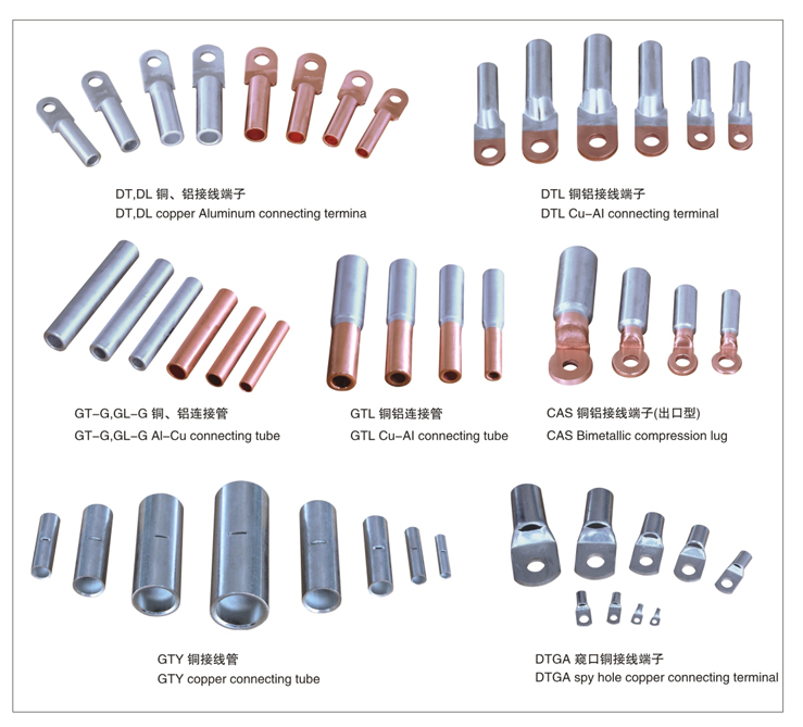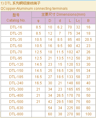 DTL series Al-Cu connection terminal is suitable for transition joint of distribution device aluminum core cable and electric equipment.DL aluminum is used for aluminum terminal linking of aluminum core cable and electric equipment.DT copper terminal i